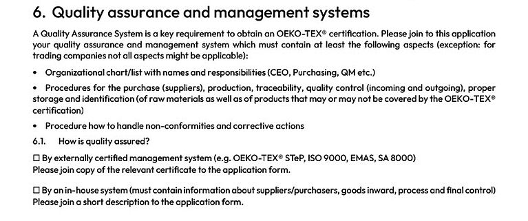 - Documented standard operating procedures for the purchase (suppliers), production, traceability, quality control (incoming and outgoing), proper storage and identification (of raw materials as well as products that may or may not be covered by the OEKO-TEX® certification)