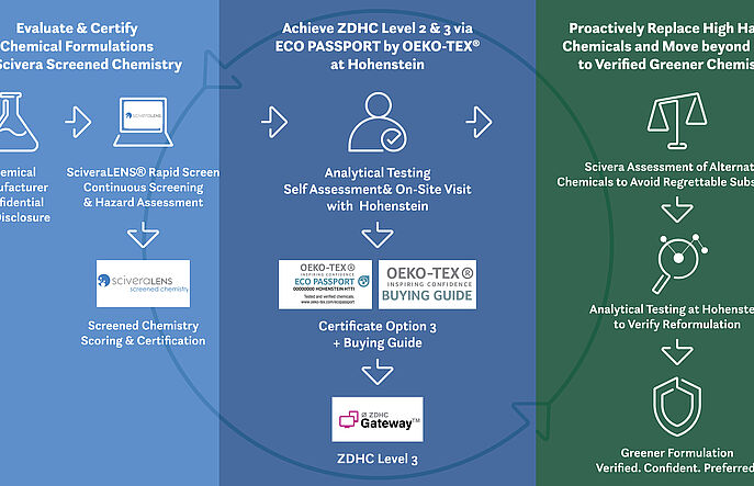 Engaging with Hohenstein or Scivera as their lead service provider, chemical suppliers can take advantage of the streamlined process to meet greener chemistry requirements for a growing number of brands. Formulations certified with Screened Chemistry through Scivera and conforming to ZDHC MRSL level 3 through ECO PASSPORT by OEKO-TEX® with Hohenstein can go beyond level 3 by assessing and verifying greener attributes.